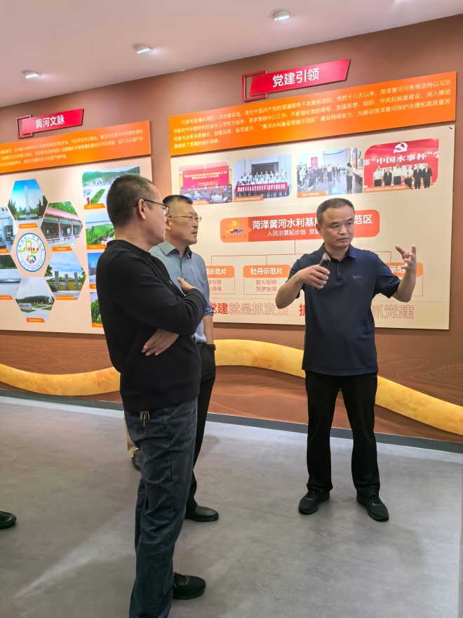 陈支庆王庆高一行实地参观考察了东明高村历史文化苑、水文站及鄄城冀鲁豫黄河水利委员会旧址展厅。大家通过珍贵史料和现场讲解,深入了解菏泽黄河红色治黄历史和生态保护实践,深刻感悟党领导人民治黄的初心使命。陈支庆表示,这些红色资源是党建引领的生动教材,为大思政课教育提供了鲜活载体,学院将以基地为纽带,推动黄河战略深度融入大思政课建设。