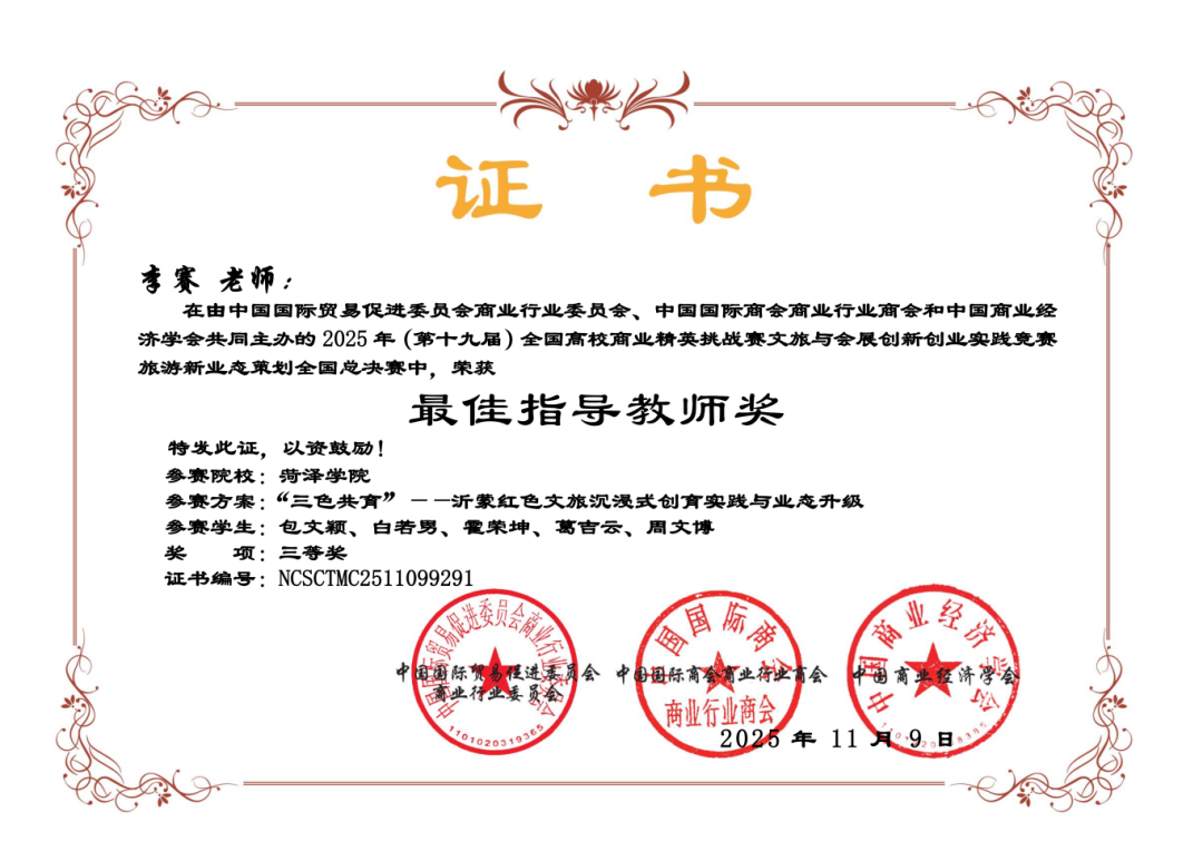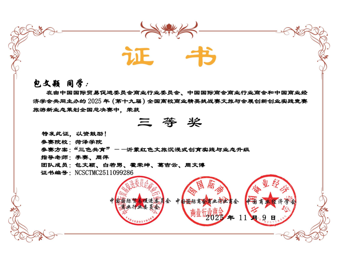2023级思想政治教育专业包文颖团队(团队成员:白若男、霍荣坤、葛吉云)凭借作品《“三色共育”——沂蒙红色文旅沉浸式创育实践与业态升级》,荣获第十九届全国高校商业精英挑战赛文旅与会展创新创业实践竞赛旅游新业态策划全国总决赛三等奖。该项目聚焦沂蒙红色文化资源的创新转化,以“沉浸式创育”为核心,探索红色文旅与思政教育融合的新路径,既彰显了红色文化的时代价值,也体现了思政专业学子服务地方文旅发展的责任担当。团队的优秀表现,离不开李赛、周萍两位指导老师的悉心指导,从项目立意到方案打磨,指导老师全程为团队提供了专业支持与方向引领。