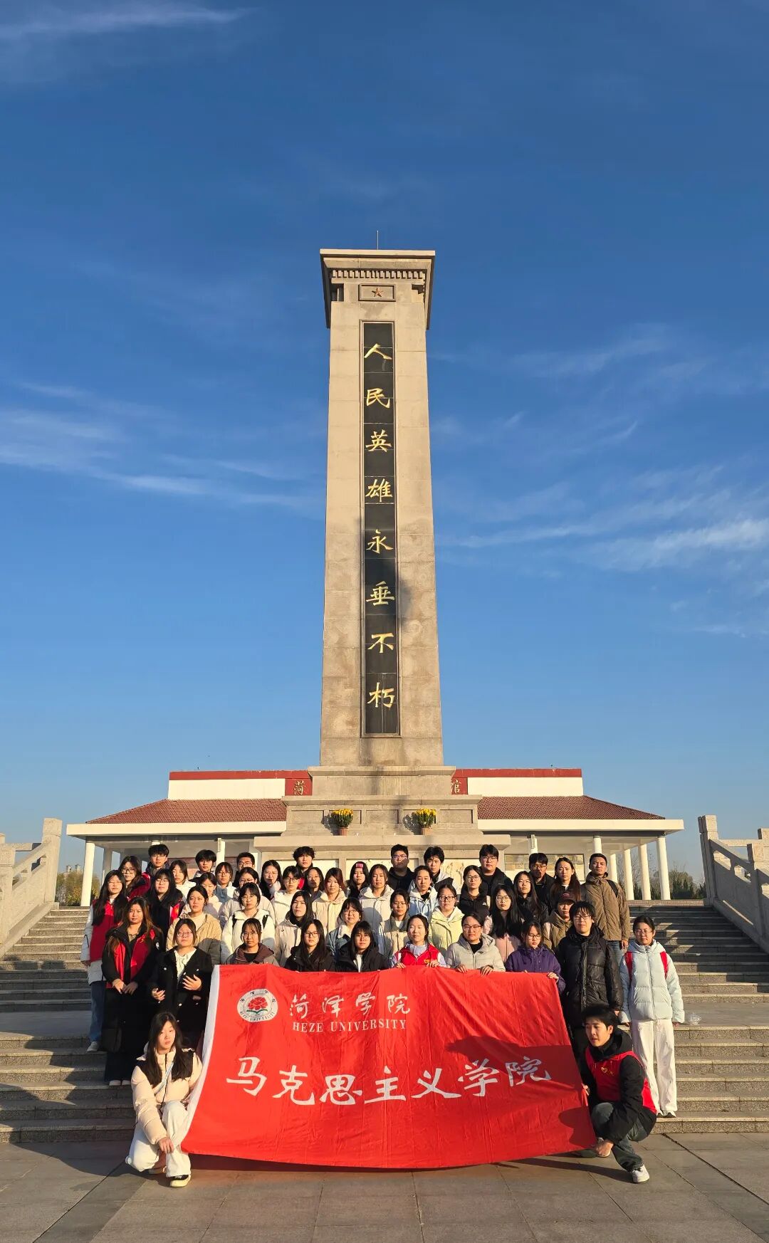 为深化思想政治理论课教学实效,11月22日,菏泽学院马克思主义学院组织师生代表开展实践教学活动。在学院王禹军、闫海青、张恒润三位老师的带领下,师生们先后前往菏泽市烈士陵园(菏泽市抗日纪念馆)、鲁西南烈士陵园和巨野博物馆进行参观学习。